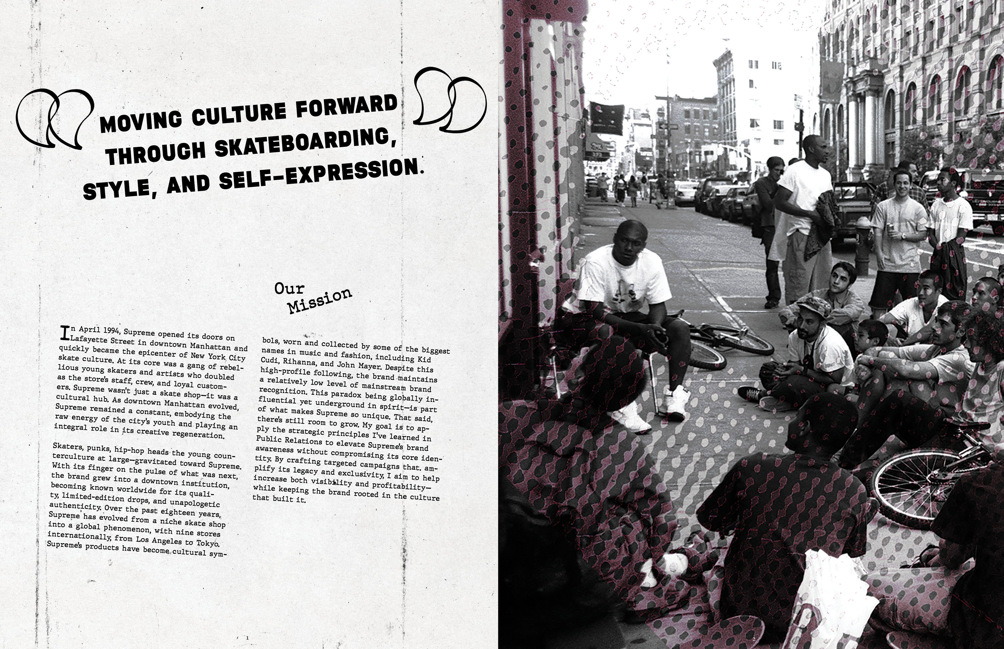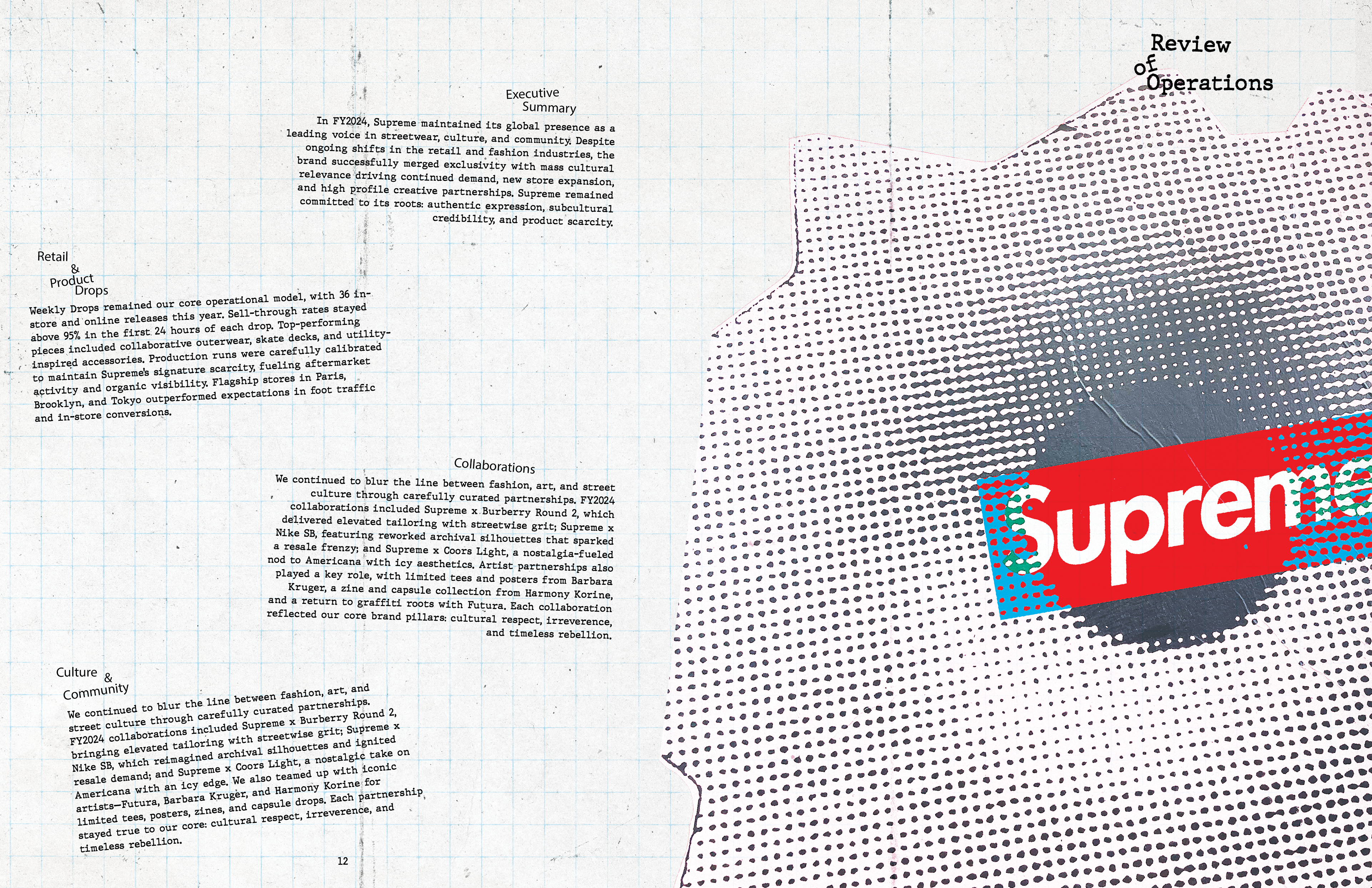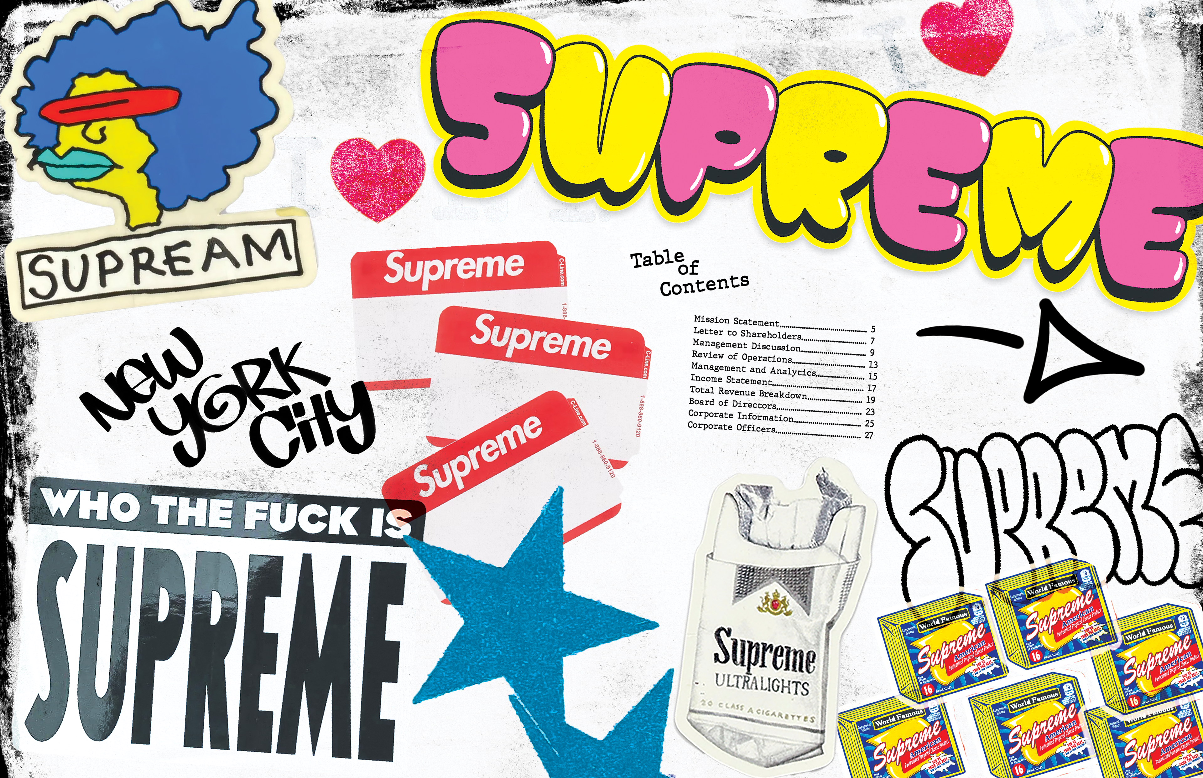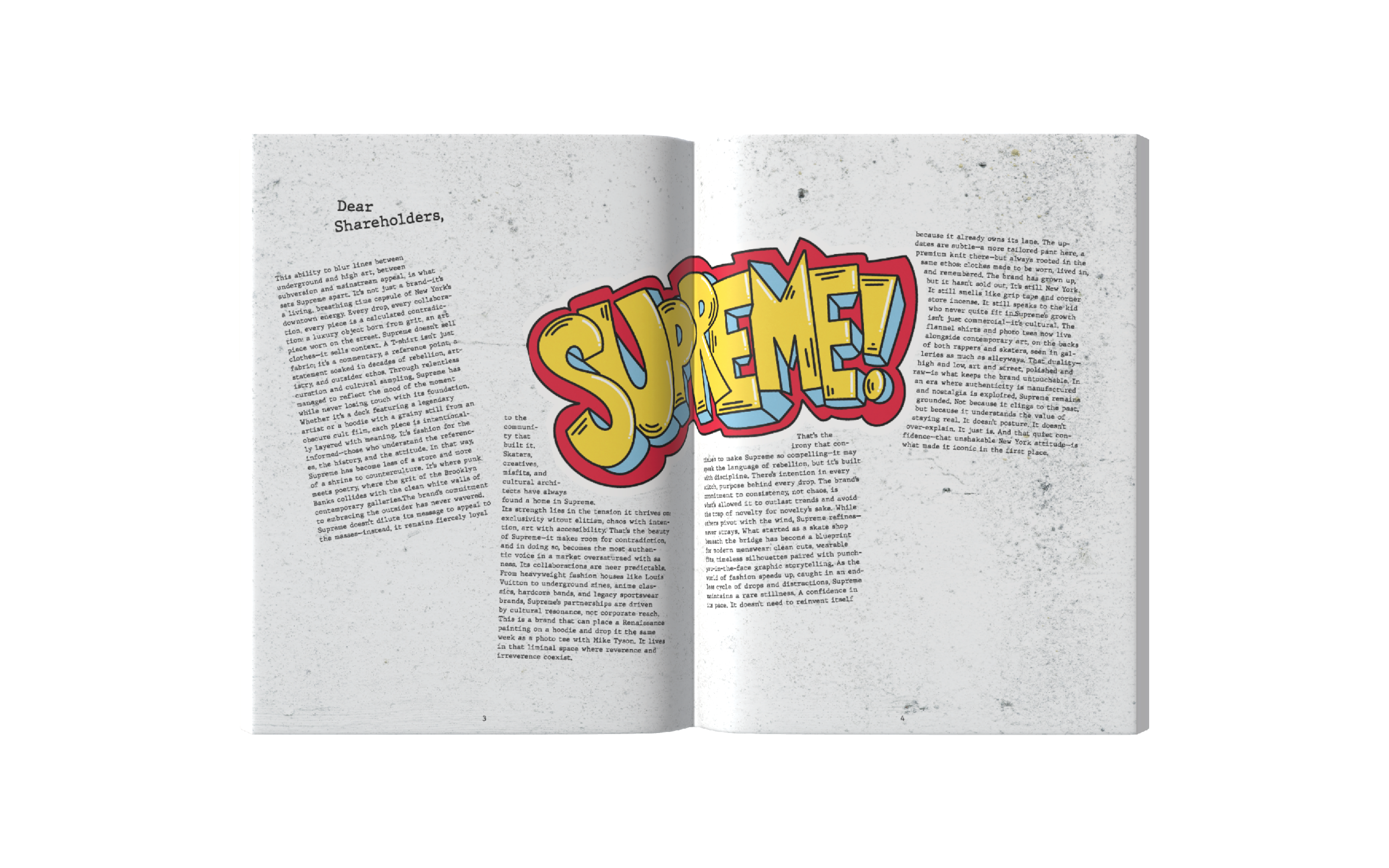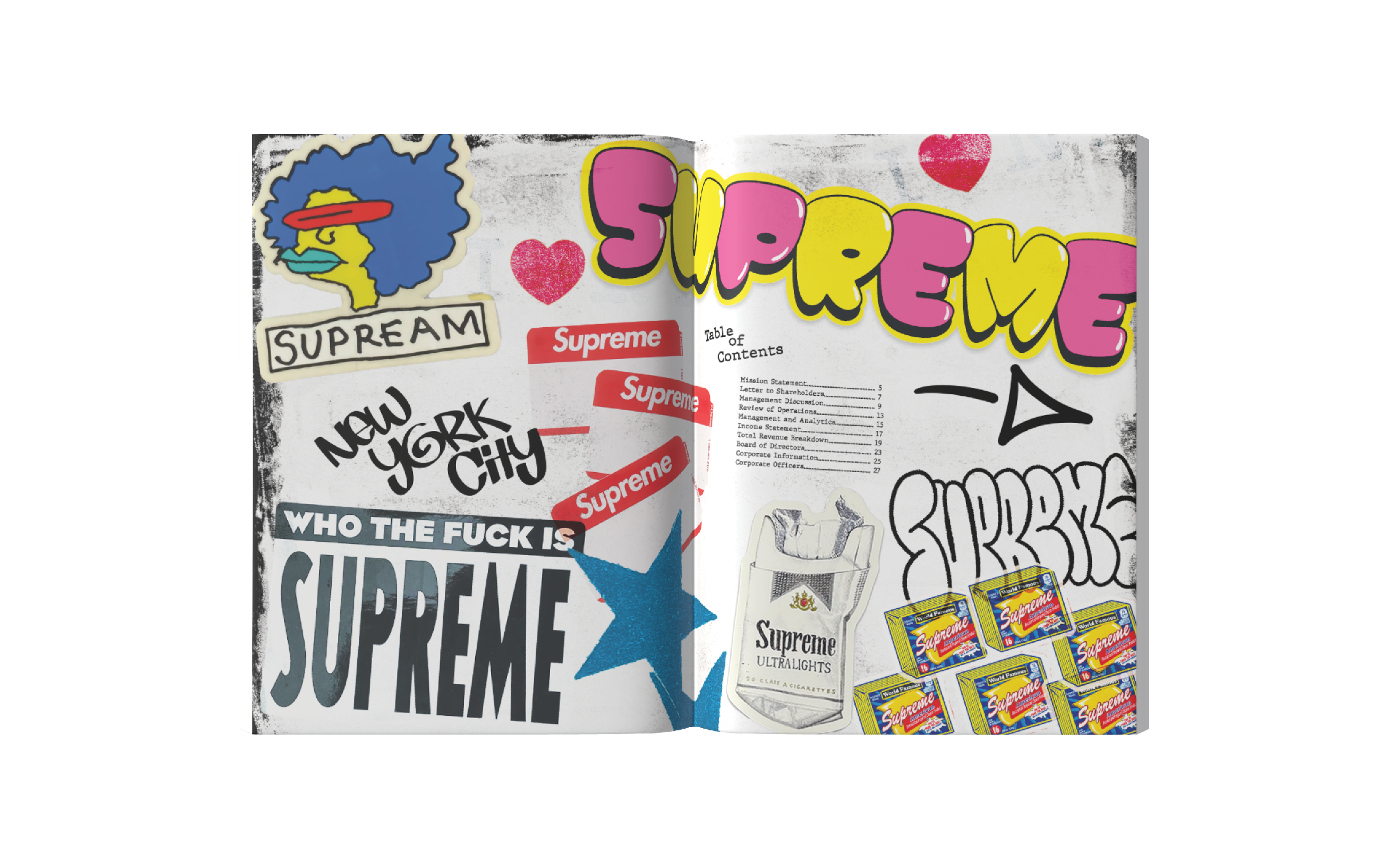 This annual report captures the identity of Supreme NY through a gritty, grunge-inspired aesthetic reflective of New York City. Designed with custom graffiti-style typography, high-contrast layouts, and layered and scanned-in textures and halftones, the project incorporates original elements from the store’s artwork. I photographed and edited these visuals to use as assets throughout the project. The result channels Supreme’s iconic streetwear roots, reflecting the energy, edge, and visual noise of the brand, while honoring the aesthetic that defines both the brand and the city itself.