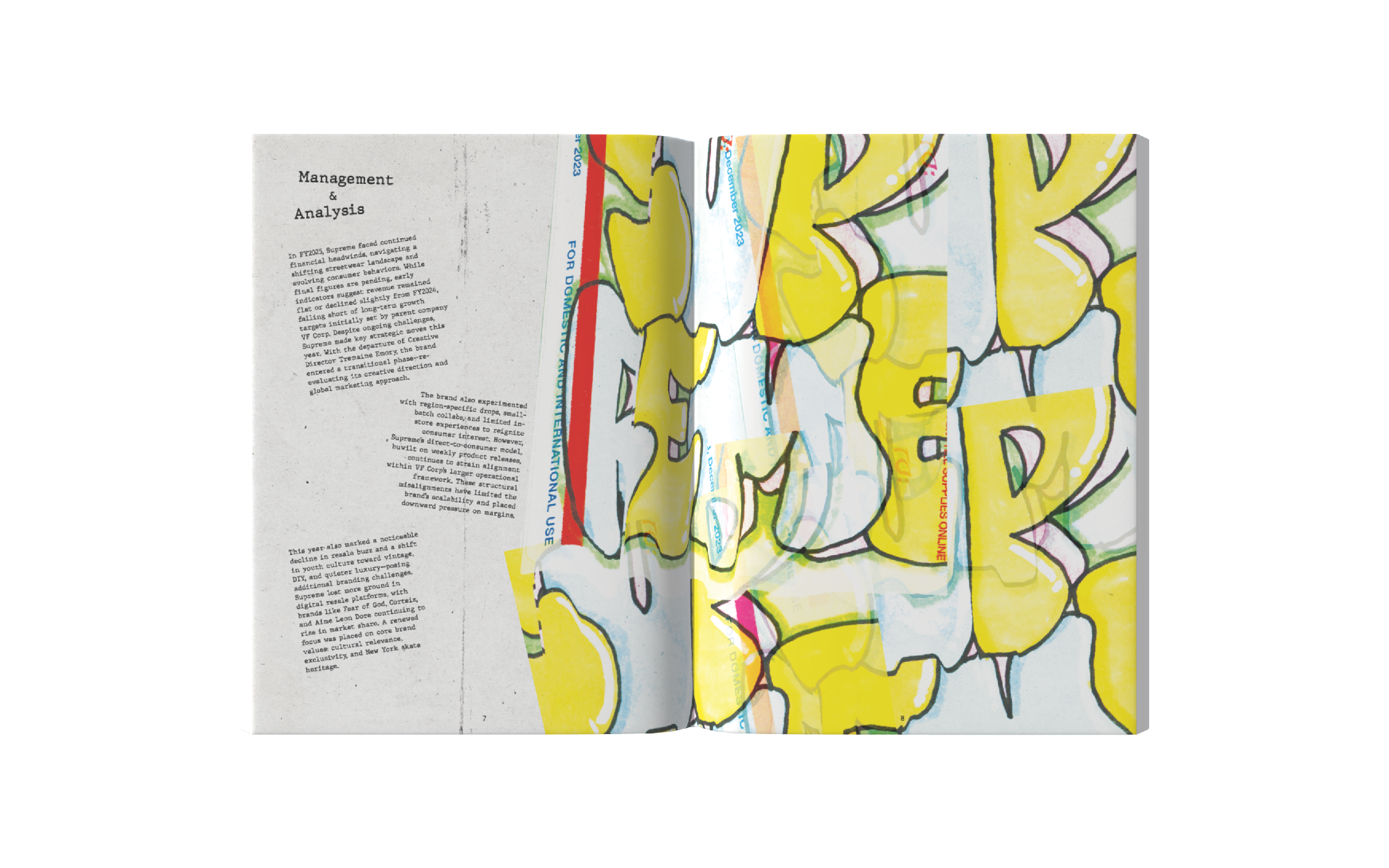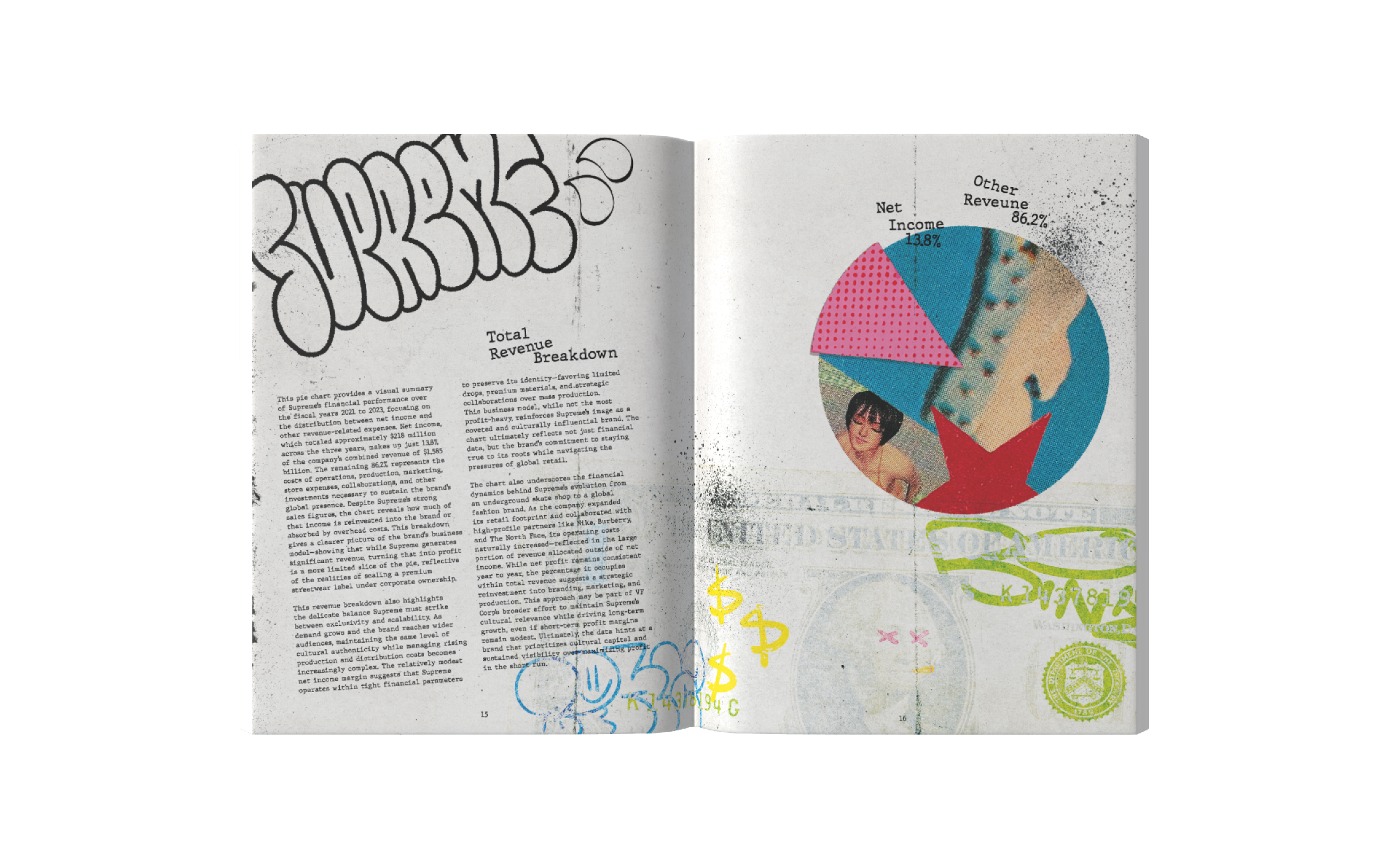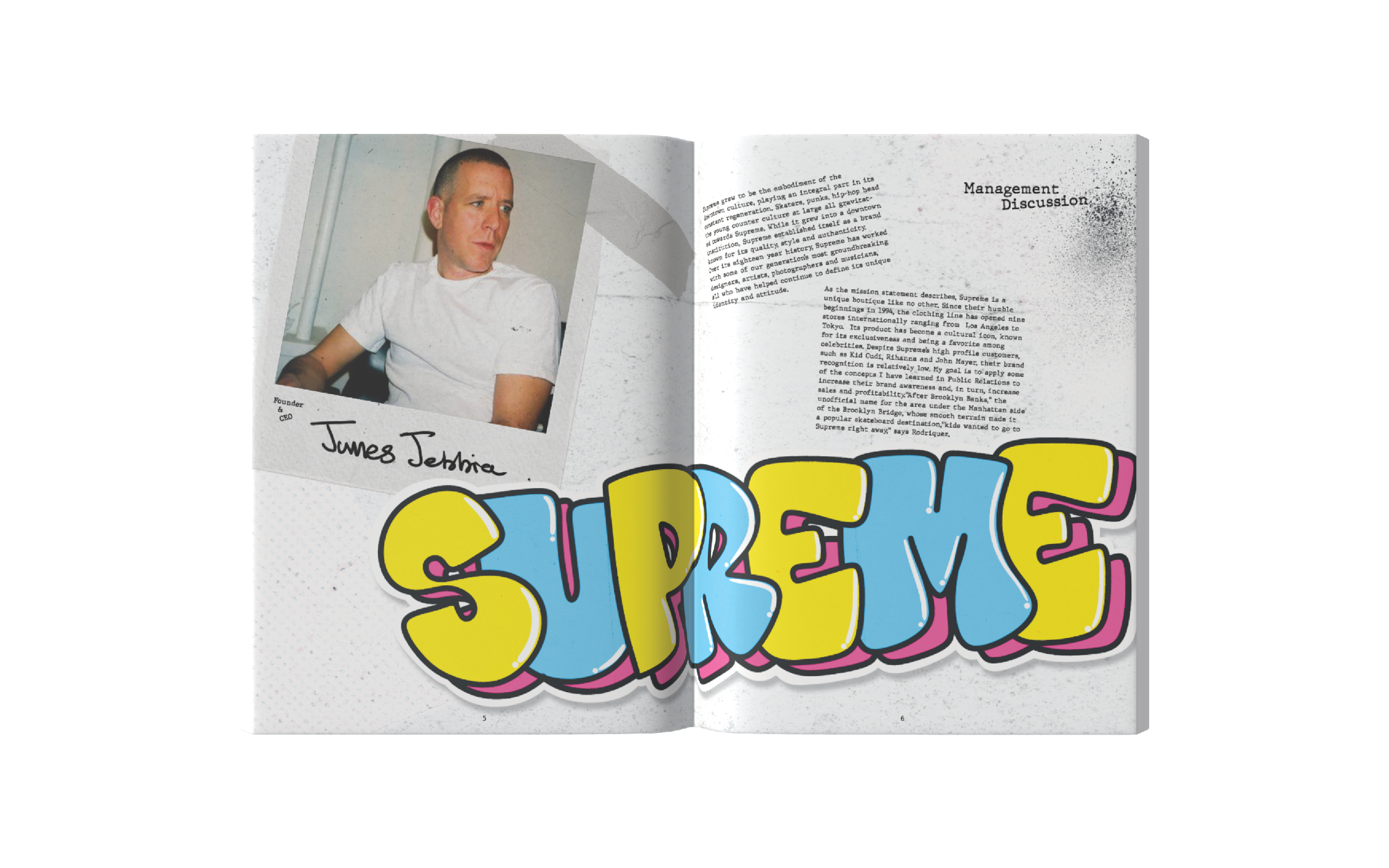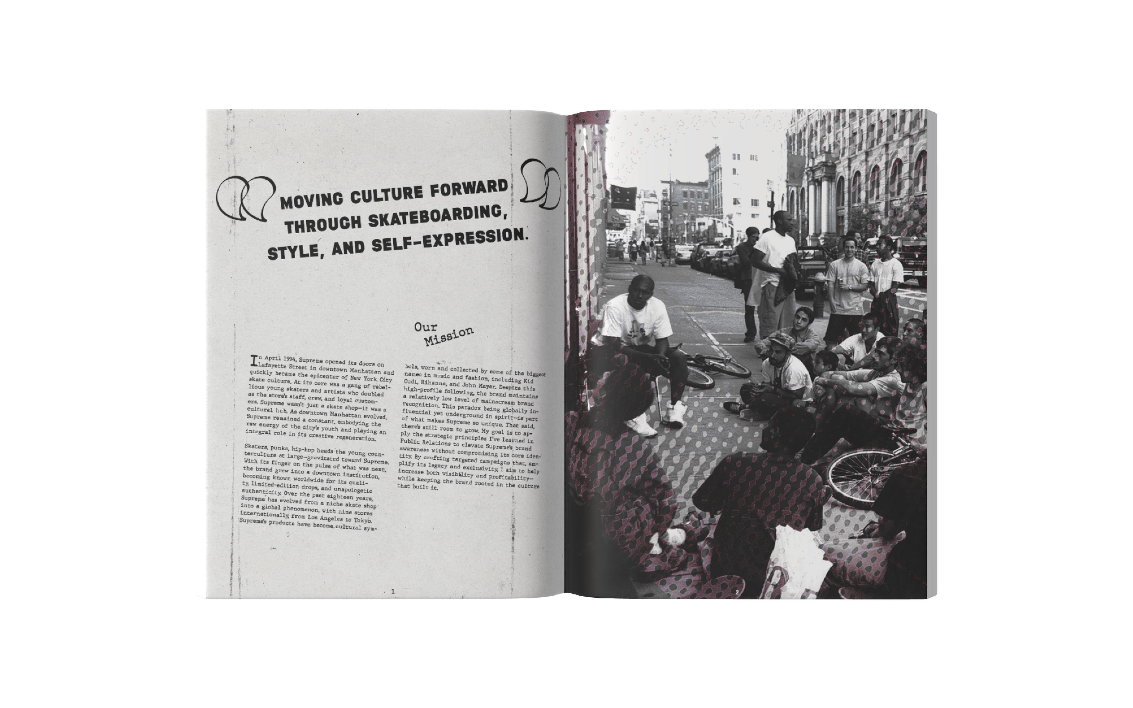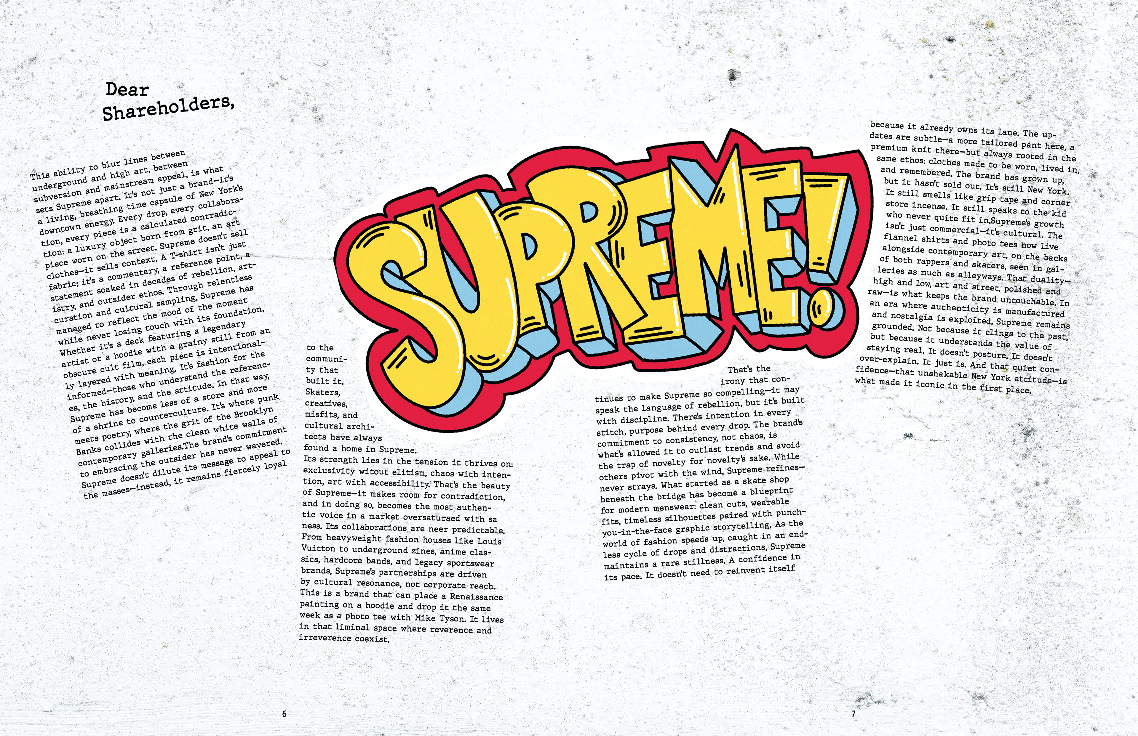 This annual report captures the identity of Supreme NY through a gritty, grunge-inspired aesthetic reflective of New York City. Designed with custom graffiti-style typography, high-contrast layouts, and layered and scanned-in textures and halftones, the project incorporates original elements from the store’s artwork. I photographed and edited these visuals to use as assets throughout the project. The result channels Supreme’s iconic streetwear roots, reflecting the energy, edge, and visual noise of the brand, while honoring the aesthetic that defines both the brand and the city itself.