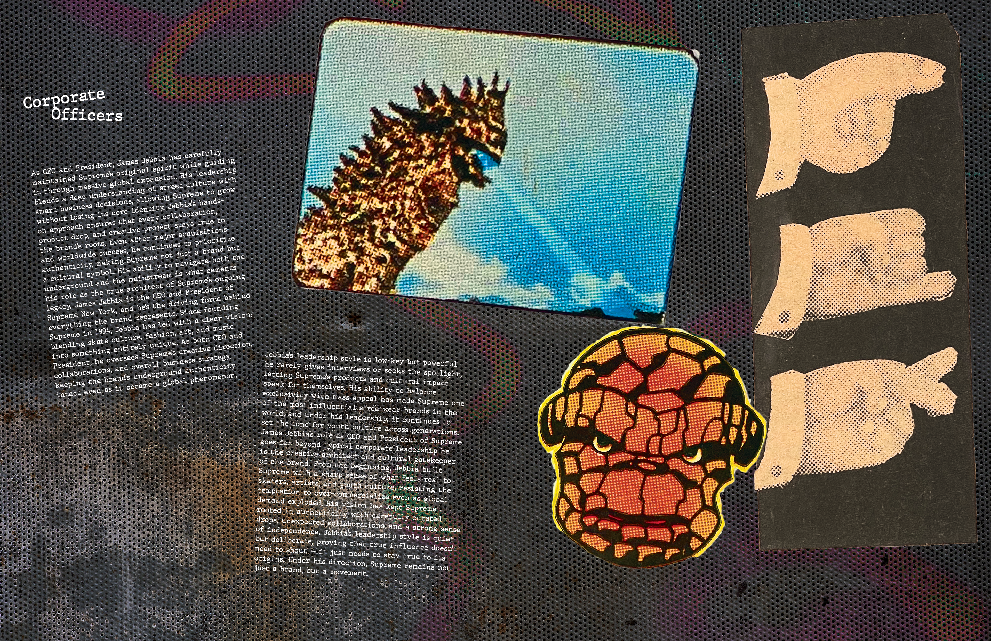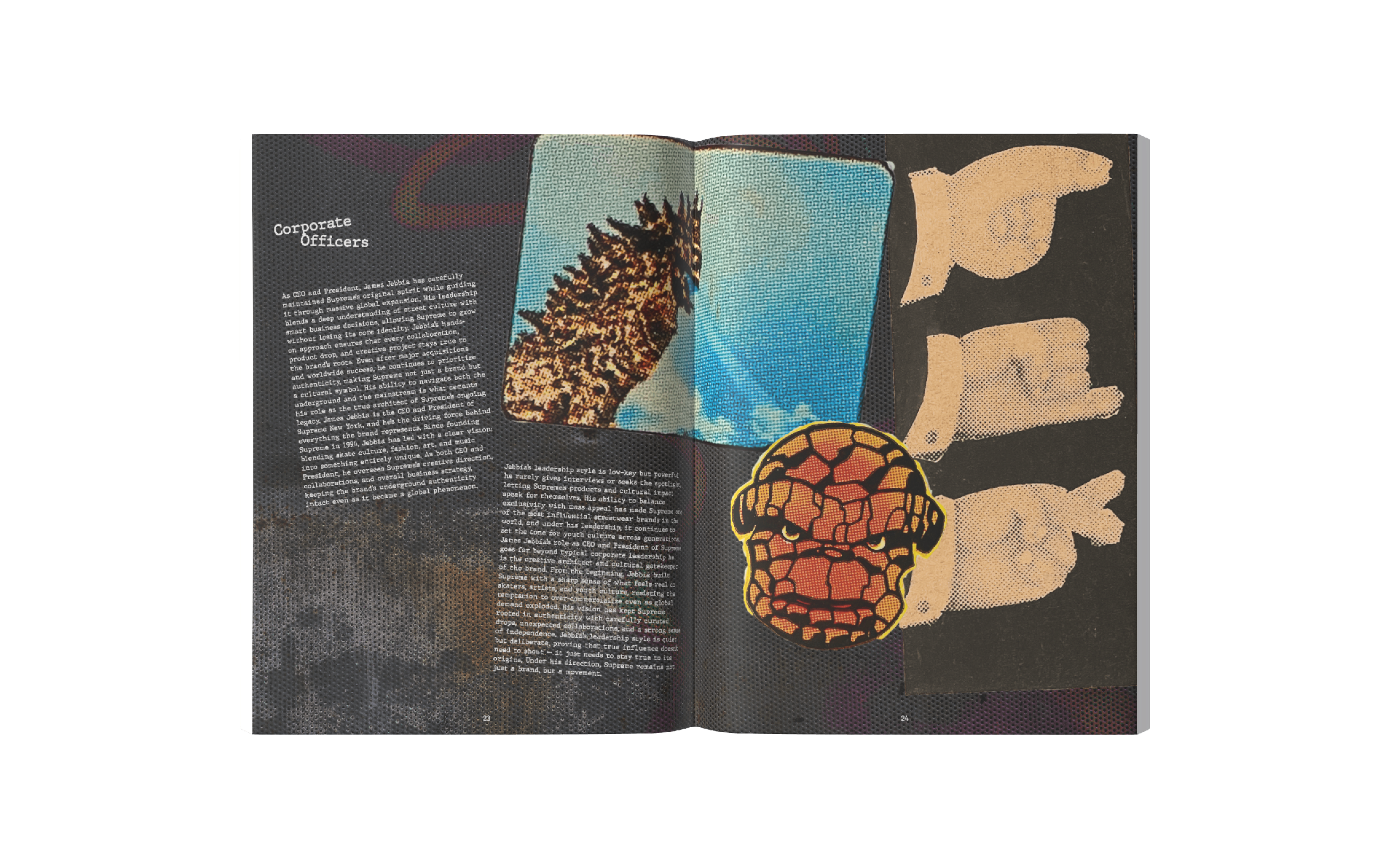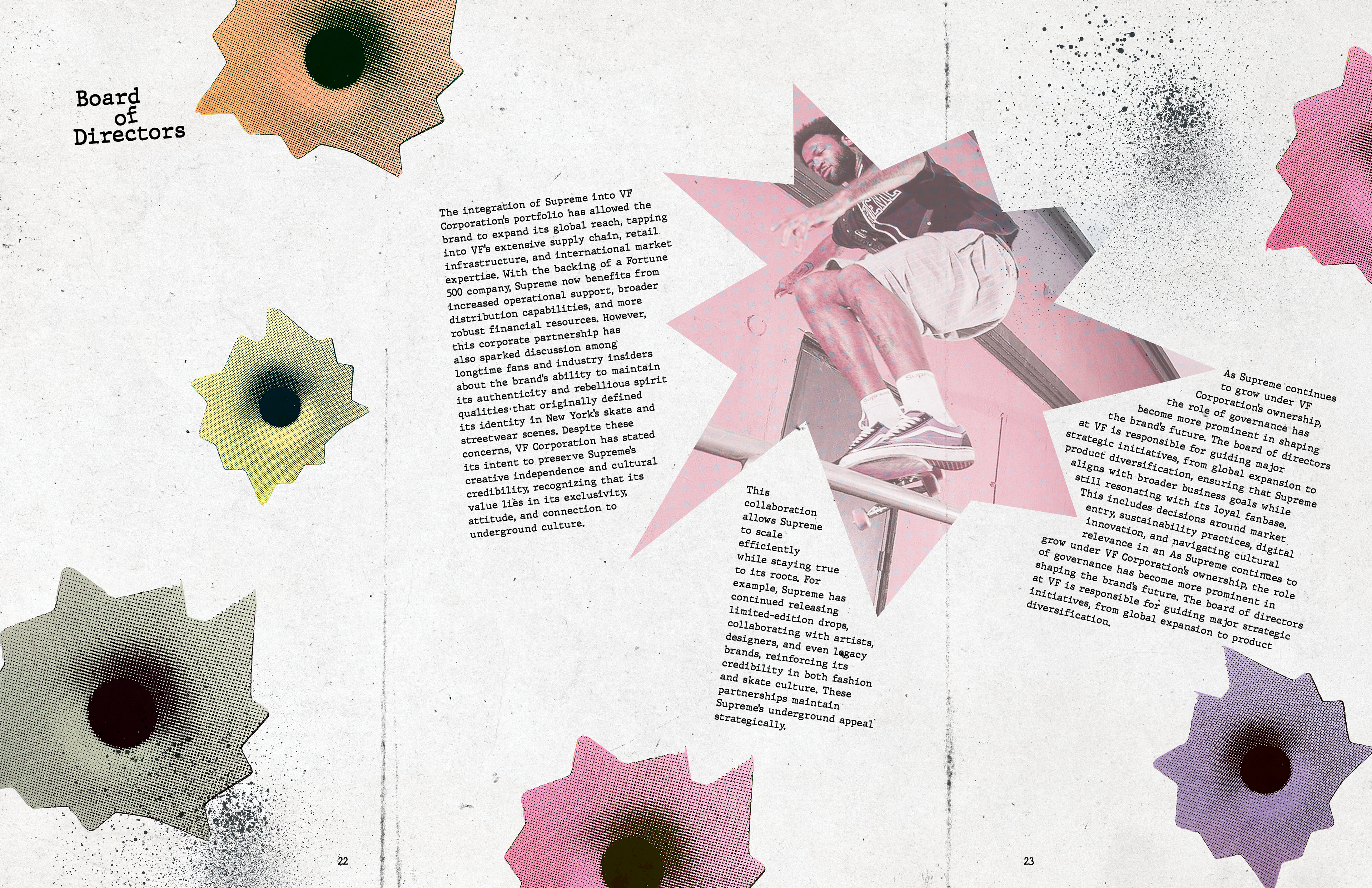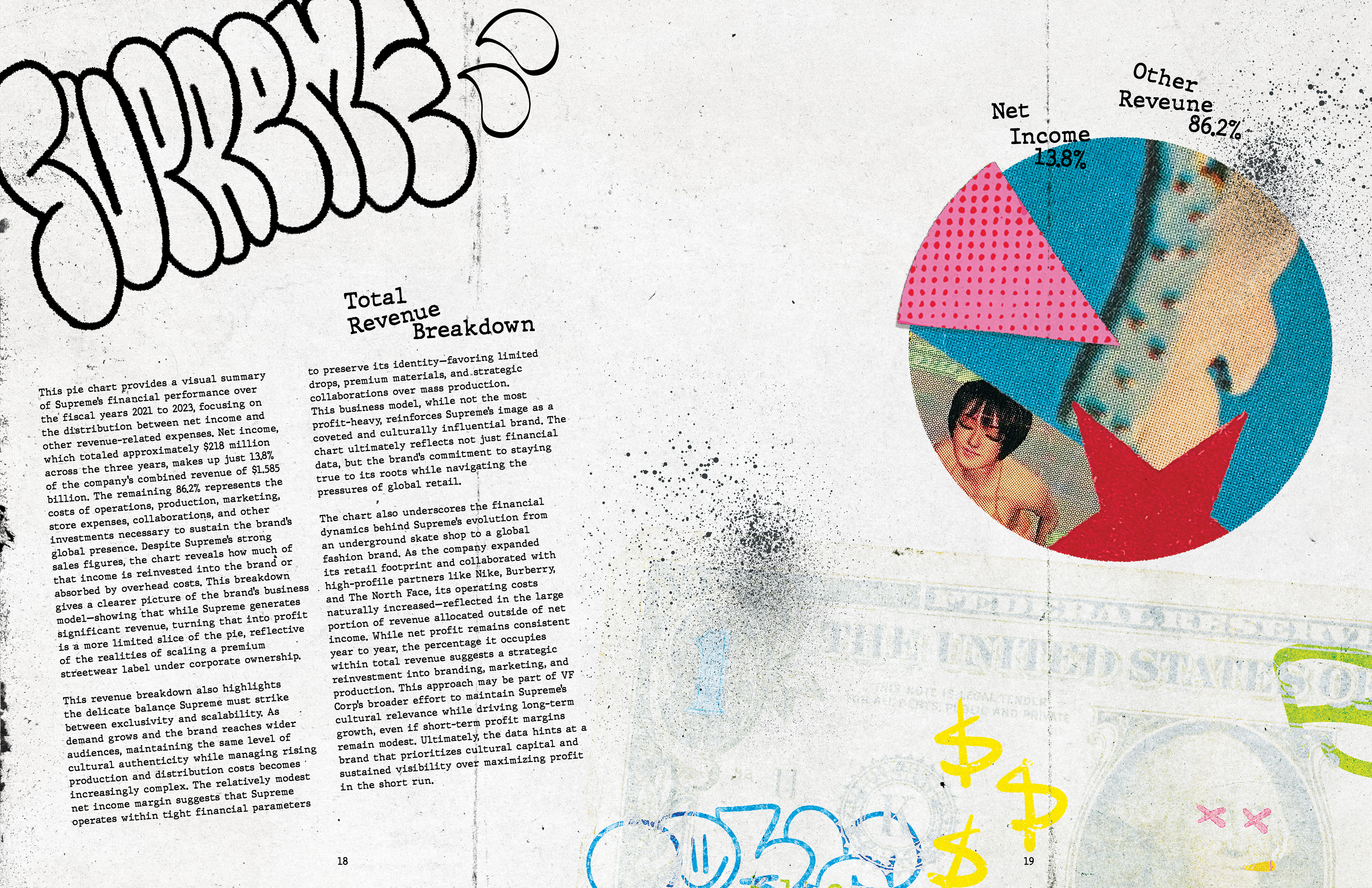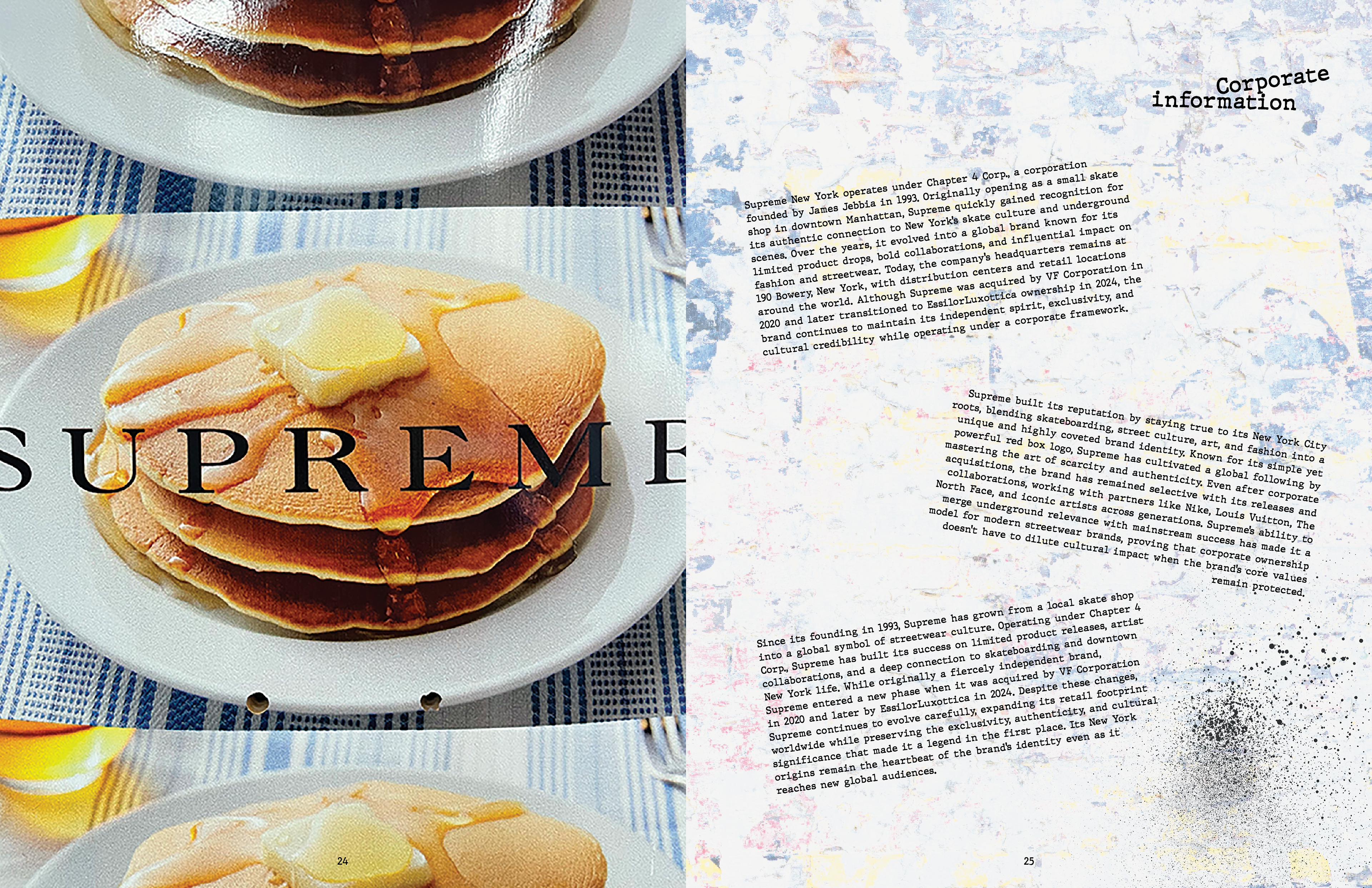 This annual report captures the identity of Supreme NY through a gritty, grunge-inspired aesthetic reflective of New York City. Designed with custom graffiti-style typography, high-contrast layouts, and layered and scanned-in textures and halftones, the project incorporates original elements from the store’s artwork. I photographed and edited these visuals to use as assets throughout the project. The result channels Supreme’s iconic streetwear roots, reflecting the energy, edge, and visual noise of the brand, while honoring the aesthetic that defines both the brand and the city itself.