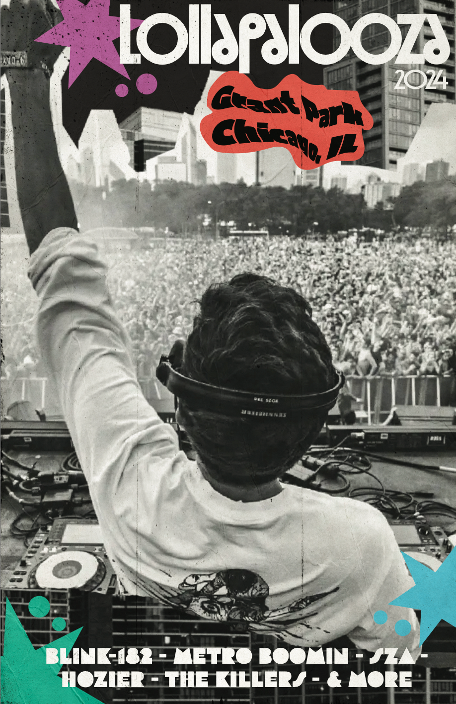 For this project, I randomly selected three design prompts from a hat: music festival poster, photography-based, and grunge. I chose to create a poster for the 2024 Lollapalooza music festival, using gritty textures, bold imagery, and distressed typography to capture the raw, high-energy vibe of both the festival and the grunge aesthetic. Every element, from the photo treatment to the type choices was crafted to reflect the chaotic, expressive spirit of live music.